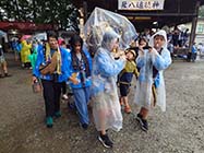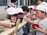 池田町会染小学校の3年生27人は12日、総合的な学習の時間に流しそうめんを中庭で行った。自分たちで手作りした全長約20bの竹樋を使って、心ゆくまでそうめんを味わった。 |
