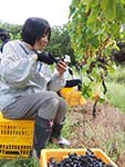 21日は、ワイナリー「ドメーヌ・ヒロキ」のほ場でワイン用ブドウの収穫体験を行った。手も口も盛んに動かしながら、摘果用ばさみでメルローを収穫した。