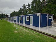 管理棟は昭和53(1978)年の「やまびこ国体」に合わせて建設されたが、老朽化に伴い建て替えられた。新施設は高さ2・9b、奥行2・5b、幅6または12bの木造ユニットを複数接続した構造で、各競技場の延べ床面積は138平方b。大会運営用の事務室と医務室、男女それぞれのトイレとロッカールームなどを備える。10月1日から供用開始される。