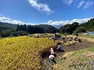 白馬村北城青鬼地区の棚田で27日、村特産の古代米「紫米」の稲刈り作業が行われた。秋晴れのもと、昔ながらの手作業での収穫に汗を流した。 |