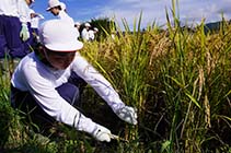 大町市内の各小学校で、5年生による本年度の米作りが収穫の時期を迎えている。学校再編に伴い本年度で閉校となる大町東小学校では24日、同校最後の稲刈りが行われた。児童たちは黄金色に実った稲を手刈りする昔ながらの収穫作業に汗を流した。 |