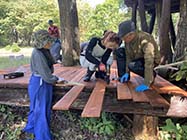 大町市のNPO法人ぐるったネットワーク大町は28日、大町市平の農業用水路公園・わっぱらんどで、ツリーハウス下のデッキの修復作業を行った。昨年の北アルプス国際芸術祭2024で、北アルプス林研グループの作品「森づくりアート」で用いられたスギ材を使い、老朽化していたデッキがよみがえった。