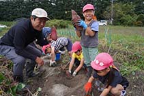 大町市社のどんぐり保育園(矢口芳美園長)の園児が6日、社地区で農業を営む内川篤さんの畑で、サツマイモの収穫作業を体験した。小さな手で懸命に土を掘り起こしながら、大きなサツマイモを収穫し、豊作を喜んだ。