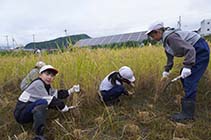 同校では毎年、地元農家の協力の下、田んぼを借りて米作りを行っている。近年は機械化が進み、農家の子どもたちでも手刈りでの収穫は初めてという児童が大半。児童は稲刈り鎌を手にいっせいに田んぼに入り、刈り取っていった。 |