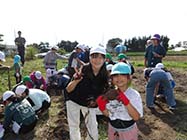大町市の大町南小学校5年生が17日、近くのあすなろ保育園から年長園児を招き、同校の畑でサツマイモの収穫作業で交流した。 |