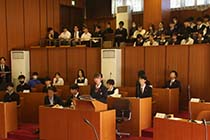 生徒69人が議場を訪れ、一般質問する生徒が議員席に座り、他は傍聴席で聞いた。議員が行政役を務め、各質問に対して担当する議員が各課に聞き取りした上で答弁した。