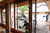 「高瀬荘」窓ふきと中庭清掃 郵便局長協会北安ブロック 池田で恒例の奉仕活動