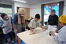 大町市平花見地区の有志でつくる「はなみフラワーズ」(田邊一弘代表)は10月26日、「秋のお楽しみ会」を花見公民館で開いた。そば打ち名人の打った新そばを味わい、集まった人もそば打ちを体験しながら交流を深めた。 |