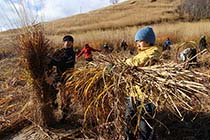 クラブの茅刈りは10年ほど前から実施しており、茅葺き屋根を手掛ける小谷屋根に刈った茅を買い取ってもらう形で活動費を稼いでいる。同日は参加人数が多く順調に作業が進行。大人が鎌を使って刈り、中学生が束ねて運んだ。 |