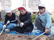 池田町金の鈴農作物等生産組合の「桜仙峡あずき保存会」の指導で、会が特産品として育てる小豆の種まきから収穫までを体験した。前もって収穫しておいたサヤ付きの豆をむしろに置き、竹の棒でたたき、サヤから粒を外す作業を繰り返した。残った小豆は、一つずつ手で外していった。 |