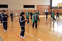 体育でダンスを学ぶ「表現」の単元の一環。保存会踊り指導部7 人が訪れ、同会副会長で踊り指導部長の奥原紘子さんが24の動きを順に指導。特徴的な手の返しや、回転する足さばきなど、細かな部分まで手ほどきした。生徒たちは輪になって講師の動きをよく見ながら、体で振り付けを覚えていった。