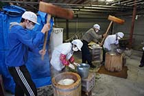 大町市常盤須沼の農産物直売所「かたくり」で今年も26日から、直売所の凍りもち部会による、正月予約用の餅の生産が始まった。市内外から106臼分の予約があり、部会員20人余りが本物のきねつき餅で良い一年の始まりを迎えてもらおうと、製造に励んでいる。 |