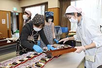 松川村社会福祉協議会は30日、年末年始を高齢者のみで過ごす村内の家庭におせち料理を届けた。ボランティアと職員合わせて14人が住民の健康と長寿を願い、手作りの縁起物をパックに詰めた。