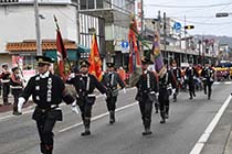 1年の無災害を祈念しながら、消防防災意識の向上を図る「大町市消防出初式」が11日、中心市街地や市文化会館で開かれた。市消防団や各地区の自主防災会、園児ら約300人が参加。市中パレードや分列行進などを披露し、火災や地震など災害に備える気持ちを新たにして、防災意識を高めた。 |