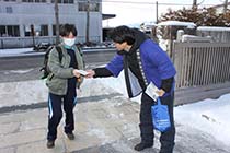 大町市選挙管理委員会と県選挙管理委員会北アルプス地方書記は衆院選公示前日の26日、街頭啓発活動を大町岳陽高校で行った。市選管の委員や市・県の職員計5人が、登校してきた生徒にチラシなどを手渡し、投票への参加や選挙制度への理解を呼び掛けた。 |
