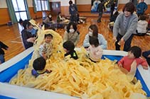 カンナくずのビニールプールでは、子どもたちがふかふかのカンナくずに飛び込んだり、寝転んだりして大はしゃぎ。木の香りと感触を、五感でたっぷりと感じていた。 |