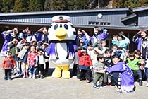 小谷村保育園に3月27日、JR大糸線を応援する法被を着た村キャラクター「たりたり」が遊びに来た。法被と、駅長をイメージした帽子を着用したたりたりと園児が園庭で遊び、春うららかな青空の下、楽しい時間を過ごした。 |