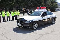 「春の全国交通安全運動」初日の6日、大北地域の合同出発式が大町市文化会館駐車場であった。県や市町村、交通安全協会、大町署などから約50人が参加し、パトカーや啓発車両で管内各地に繰り出して、交通安全を呼び掛けた。