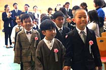 一緒に保育園を卒園した17人がそのまま入学。手をつないで入場し、在校生や保護者と向かい合わせるように着席した。少し緊張しながらもきちんとした姿勢で校長や村長の話を聞き、保育園で練習してきた「ドキドキドン!一年生」の歌も披露。教室では教科書や教材が配られ、うれしそうにしながらランドセルに入れた。 |