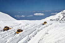 立山黒部アルペンルートは全線開通55周年を迎える。今年の除雪作業は、2月9日から車両22台編成で山麓から始まり、31・3`の区間で進められた。4月8日は巨大な雪の壁「雪の大谷」の出現に向けて、ブルドーザやバックホーがごう音を響かせながら、豪雪を掘り下げる大詰めの作業が青空の下で行われた。 |