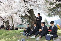 大町市の大町岳陽高校は14日、市内の桜の名所・旧大町西小学校で、初めてのお花見昼食を開いた。この春入学したばかりの1年生161人が、満開の桜の下でお弁当を楽しみ、地域の魅力に触れた。 |