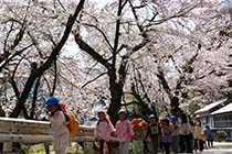 小谷村の各地で桜が見頃を迎えている。名所として知られる北小谷の島温泉では14日、村保育園の年長児と年中児がお花見に訪れ、満開の桜の下を散策。花びらが舞う中、遊具がある広場で遊びも楽しみ、存分に春を満喫していた。 |