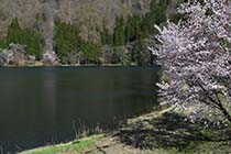 オオヤマザクラ 湖面薄桃色に 大町市平 中綱湖で見頃