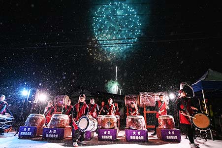 写真=降りしきる雪の中、大町流鏑馬太鼓の演奏と花火が競演